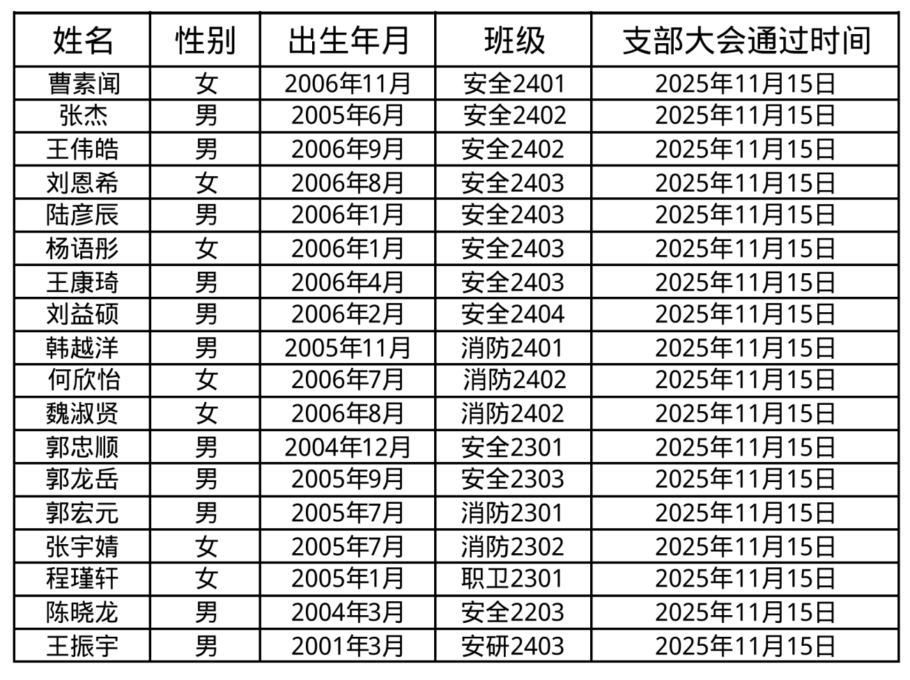 安全科学与工程学院2025年下半年接收新发展团员公示