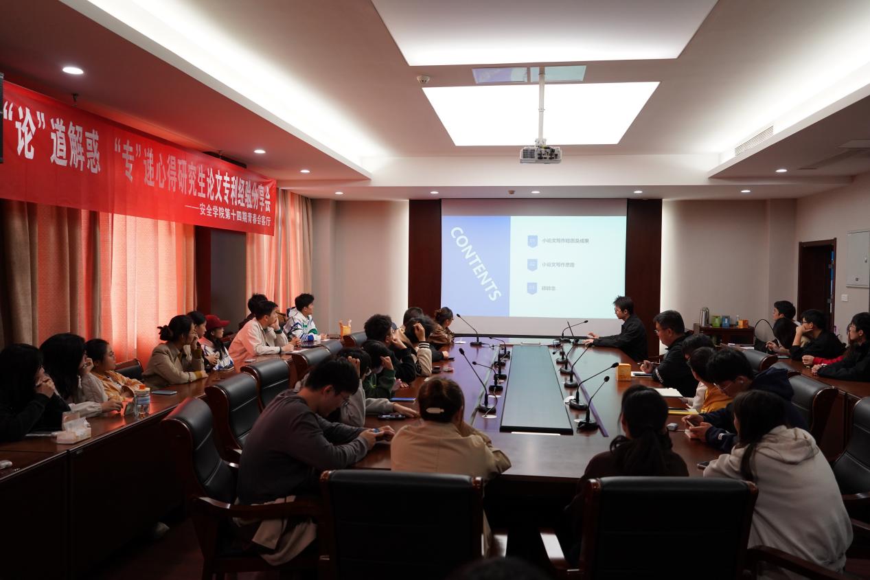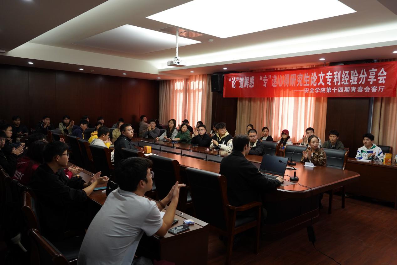 安全科学与工程学院研究生会于10月23日在厚德楼111会议室举办“‘论’道解惑,‘专’递心得”经验分享会——第十四期青春会客厅。本次活动邀请吴鹏、周纪元、喻广三位同学,分享他们在论文撰写与优化、专利投递与审查、科研绘图技巧、论文投稿策略、科研思路与经验总结等方面的宝贵经验,会议由学术部马倩主持。